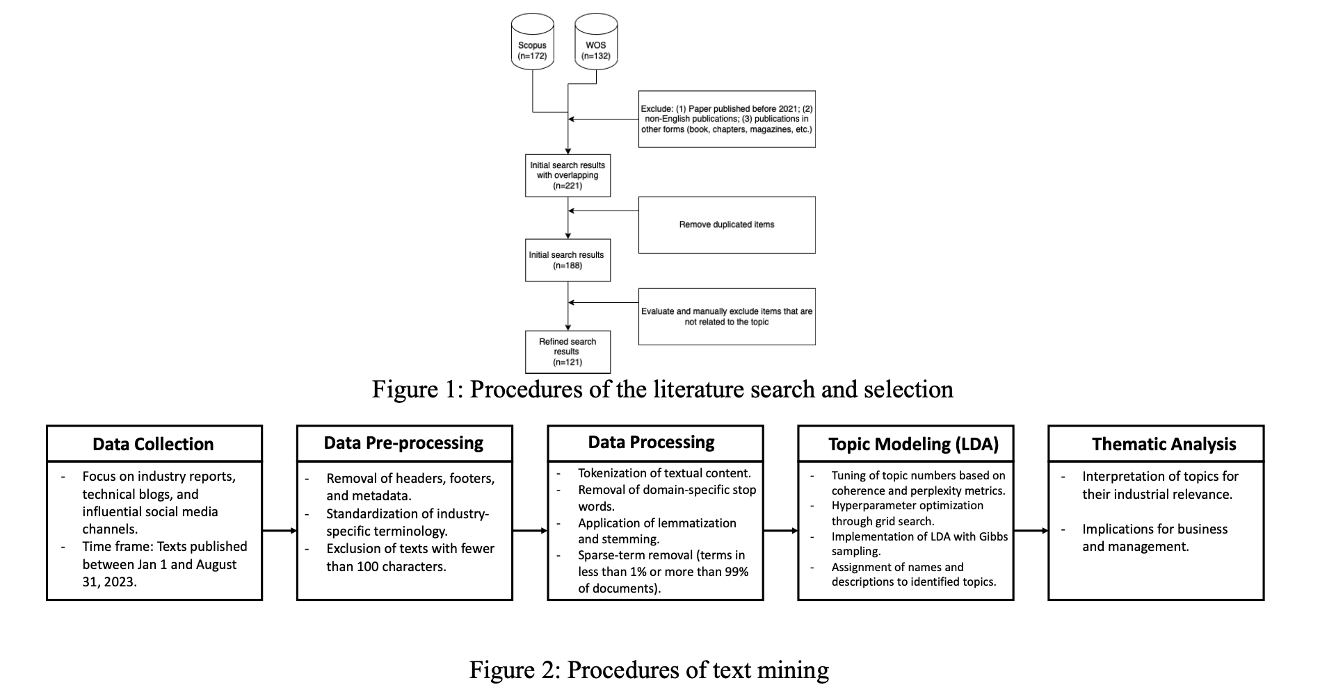 ![]() | Decoding Business Applications of Generative AI: A Bibliometric Analysis and Text Mining ApproachMay WANG*, Pengqi WANG The 23rd International Conference on Electronic Business (ICEB 2023), Chiayi, Taiwan, October 2023. The integration of Generative AI into business and management stands out as a pivotal transformation. This paper employs bibliometric analysis to scrutinize academic perspectives on the applications of Generative AI across diverse business research fields. Concurrently, text mining based on tweets and websites is deployed to probe cutting-edge industry applications of Generative AI in business and management. The Latent Dirichlet Allocation (LDA) topic modeling method unveils the profound potential of Generative AI, i.e. 1) creating new interfaces for service providers and personalized experience; 2) creating new content to augment human creativity; 3) improving efficiency and productivity, and 4) enabling more new applications, business models and use in the practical business applications. Delving into the contemporary research topics in information systems, marketing, management, and other business research, this study undertakes a comprehensive bibliometric and thematic analysis of integrated findings from both contemporary academic research fields and business application spheres to identify the research gap and explore future research context in GenAI. Moreover, this study underscores the ethical and practical challenges that emerge, advocating for interdisciplinary study on GenAI. The paper concludes by providing suggestions for future research, underscoring the importance of combining technological expertise with a human-centered approach. |